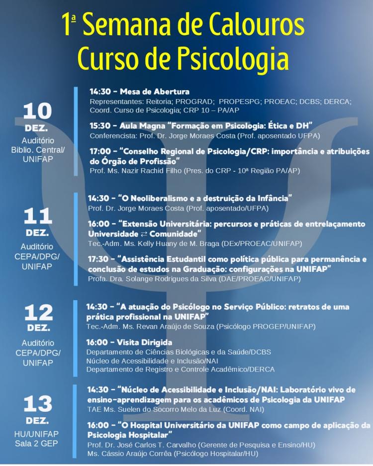 A programação terá início dia 10 de dezembro de 2024, a partir das 14h30, com a mesa de abertura realizada pelos representantes da gestão da Unifap, do Conselho Regional de Psicologia (CRP 10-PA/AP) e coordenador da graduação. Logo em seguida, será realizada a aula magna com o título “Formação em Psicologia: Ética e Direitos Humanos”, conferenciada pelo Prof. .Dr. Jorge Costa ( docente aposentado da Universidade Federal do Pará).