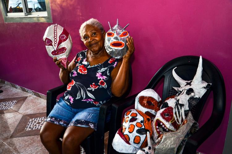 “Eu morava na casa da minha avó, próximo ao barracão onde ocorre o baile, e através de uma fresta eu via as pessoas brincando. Tinha medo de ir até lá, mas com o passar do tempo comecei a entender e admirar a tradição. Na adolescência, passei a trabalhar na confecção das peças, que hoje complementam parte da minha renda”, destacou Soares.