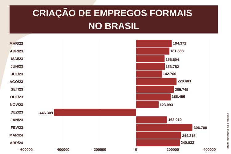 É importante destacar que, em abril deste ano, o Brasil avançou no mercado de trabalho ao criar 240.033 mil empregos formais, de acordo com o último relatório do Ministério do Trabalho e Emprego. Esse número representa um aumento de 32% em relação ao mesmo mês do ano passado, quando foram criados 181.000 empregos formais.