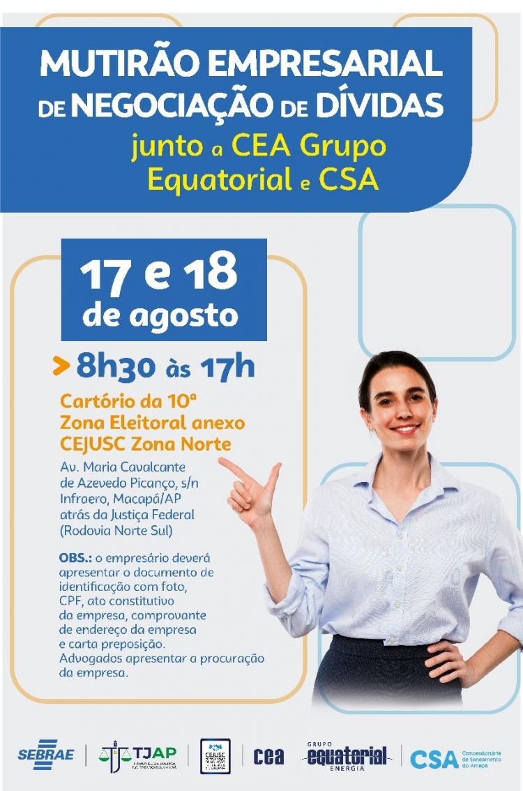 O Serviço de Apoio às Micro e Pequenas Empresas no Amapá (Sebrae) por meio do Cejusc Empresarial, em parceria com o Tribunal de Justiça do Amapá (Tjap) promovem o mutirão empresarial de audiências de negociação e conciliação de dívidas de Microempreendedor Individual (MEI); Microempresa (ME) e Empresa de Pequeno Porte (EPP) junto a CEA Grupo Equatorial Energia e a Companhia de Saneamento do Amapá (CSA). O objetivo é reduzir o endividamento das MPEs, ampliar parcerias e potencializar o desenvolvimento de ações voltadas ao fortalecimento visando a permanência no mercado. O atendimento presencial, acontece no Cartório da 10ª Zona Eleitoral, no Anexo Cejusc Zona Norte, nos dias 17 e 18 de agosto, das 8h30 às 17h.