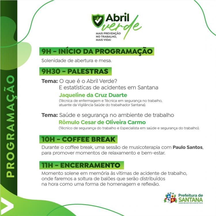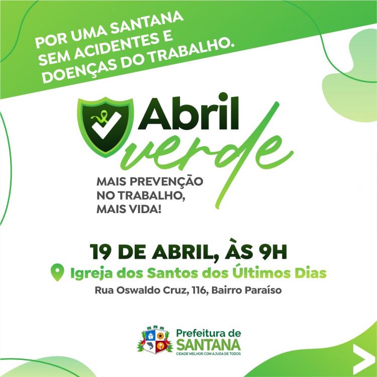 A Prefeitura de Santana realiza, no dia 19 de abril, a campanha “Abril Verde - Mais Prevenção no Trabalho, Mais Vida”, que ocorrerá na Igreja dos Santos dos Últimos Dias. O objetivo é promover a conscientização sobre a importância da prevenção de acidentes e doenças do trabalho, visando tornar o município um local seguro e saudável para todos os trabalhadores.