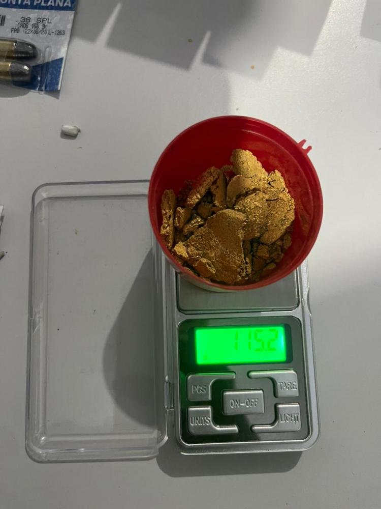 A ação policial foi realizada na última quinta-feira (11) e teve início após a abordagem de um veículo cujo condutor estava com a CNH vencida. Durante a revista do veículo, foram encontrados pequenos invólucros contendo um pó amarelo semelhante a ouro, com cerca de 115g, além de 10 munições de calibre .38.