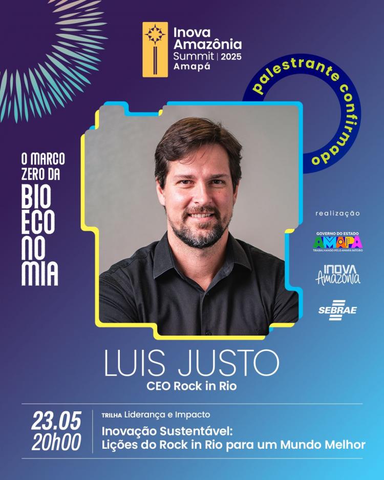 Luis Justo, CEO da Rock World, encerra as palestras magnas que serão apresentadas no Inova Amazônia Summit, com a Palestra Inovação Sustentável: Lições do Rock In Rio para um Mundo Melhor, que está presente na Trilha Cultura e Identidade. Luis irá revelar os bastidores da sustentabilidade e mostrar as ações que transformam o festival em referência global. A palestra acontecerá no Salão de Eventos Macapá, na sexta (23), às 20h.
