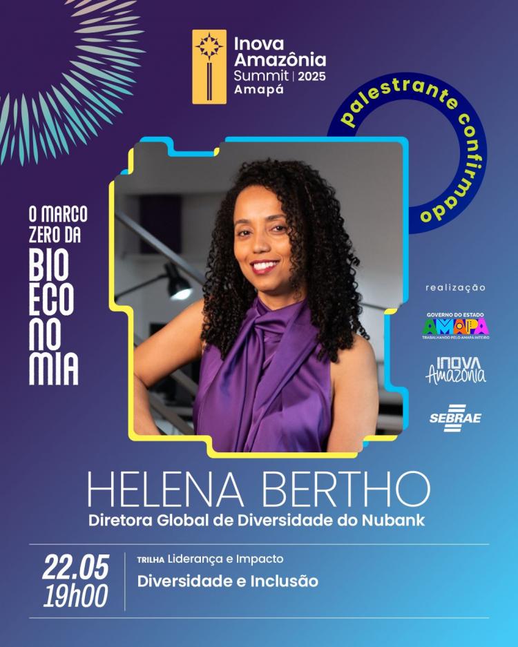 Já no segundo dia do Inova Amazônia Summit, Helena Bertho, diretora global de Diversidade e Inclusão da Nubank, realiza a Palestra Magna Diversidade e Inclusão, pensada para gerar reflexão sobre representatividade, equidade e inovação a partir da pluralidade de vozes que constroem o futuro da Amazônia. A palestra acontece na quinta-feira, 22 de maio, no Salão de Eventos Macapá, às 19h.
