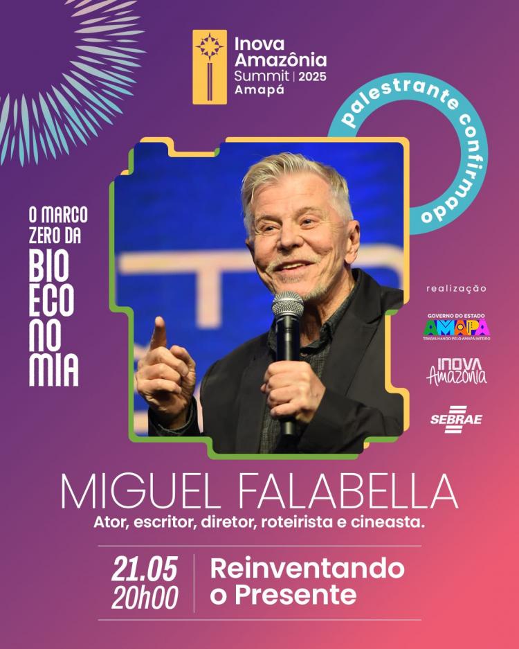 O ator Miguel Falabella, traz ao Inova Amazônia Summit a Palestra Magna Reinventando o Presente, que compõe a Trilha Liderança e Impacto. O ator conectará arte, criatividade e inovação, com o propósito de inspirar novas ideias e olhares sobre o futuro da Amazônia. Miguel Falabella encerra o primeiro dia de evento com a palestra que acontece no Salão de Eventos Macapá, na quarta-feira, 21 de maio, às 20h.
