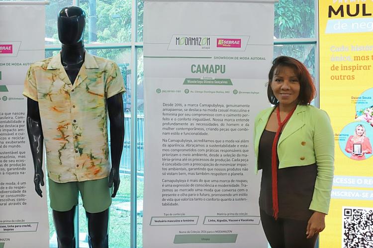 A criadora de moda e proprietária da marca Camapu, Leya Oliveira, explica sobre as inspirações e técnicas utilizadas para criar a coleção e o conjunto masculino exposto no Showroom. “Essa coleção se chama Utopia, inspirada no Rio Amazonas, e Utopia vem dos acontecimentos recentes no nosso mundo, a gente sonha com uma vida mais sustentável e consequentemente, com peças mais sustentáveis e a moda autoral traz isso como foco. Eu trabalho com tingimento natural e técnicas de tingimento, o conjunto é um tingimento com a técnica de marmorização, inspirado na existência do rio amazonas, no movimento das ondas e no reflexo do sol sob a água”, contou a criadora Leya Oliveira.