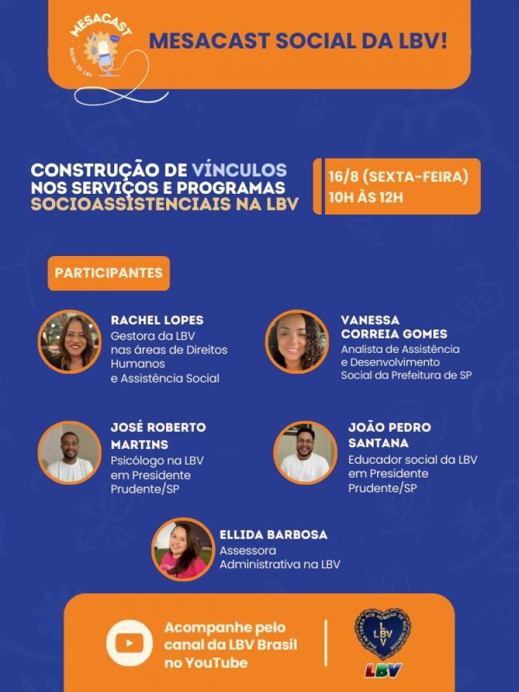 A ser realizado pela Legião da Boa Vontade, no próximo dia 16 de agosto (sexta-feira), das 10 às 12 horas, o MesaCast, evento on-line e gratuito, abordará o tema “Construção de vínculos nos serviços e programas socioassistenciais na LBV”. Este encontro dinâmico proporcionará um espaço para compartilhar ideias e opiniões sobre o assunto. A transmissão será ao vivo pelo YouTube no perfil @LBVBrasil.
