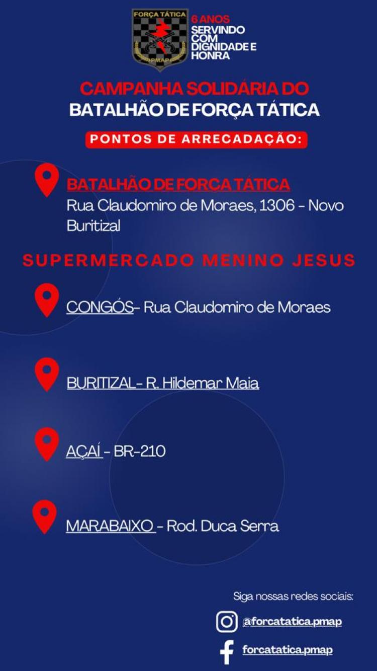Nesse contexto, surge a iniciativa do 10º Batalhão da Polícia Militar do Amapá: a Campanha Solidária de Arrecadação de Alimentos Não Perecíveis. O objetivo é auxiliar as famílias de menor poder aquisitivo e entidades filantrópicas.