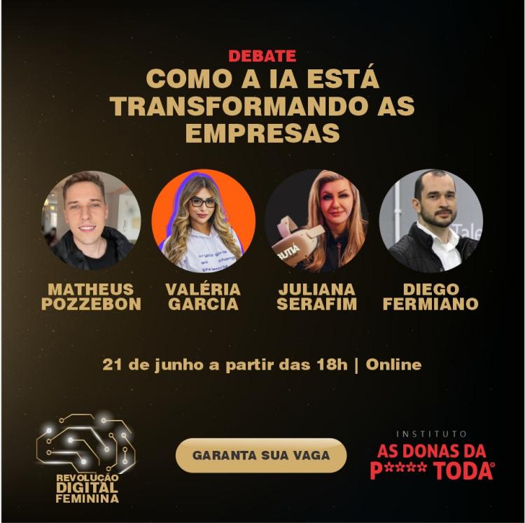 Com o surgimento da inteligência artificial e das criptomoedas, a revolução tecnológica tem exigido cada vez mais conhecimento e capacitação. Assim, o Instituto As Donas da P**** Toda acaba de lançar uma iniciativa imperdível, a “Revolução Digital Feminina”, evento on-line que acontecerá de 20 a 22 de junho, das 18h às 21h, que vai conectar mulheres em uma rede de apoio, visando impulsionar suas carreiras e auxiliá-las na conquista de patamares mais elevados em suas áreas de atuação.
