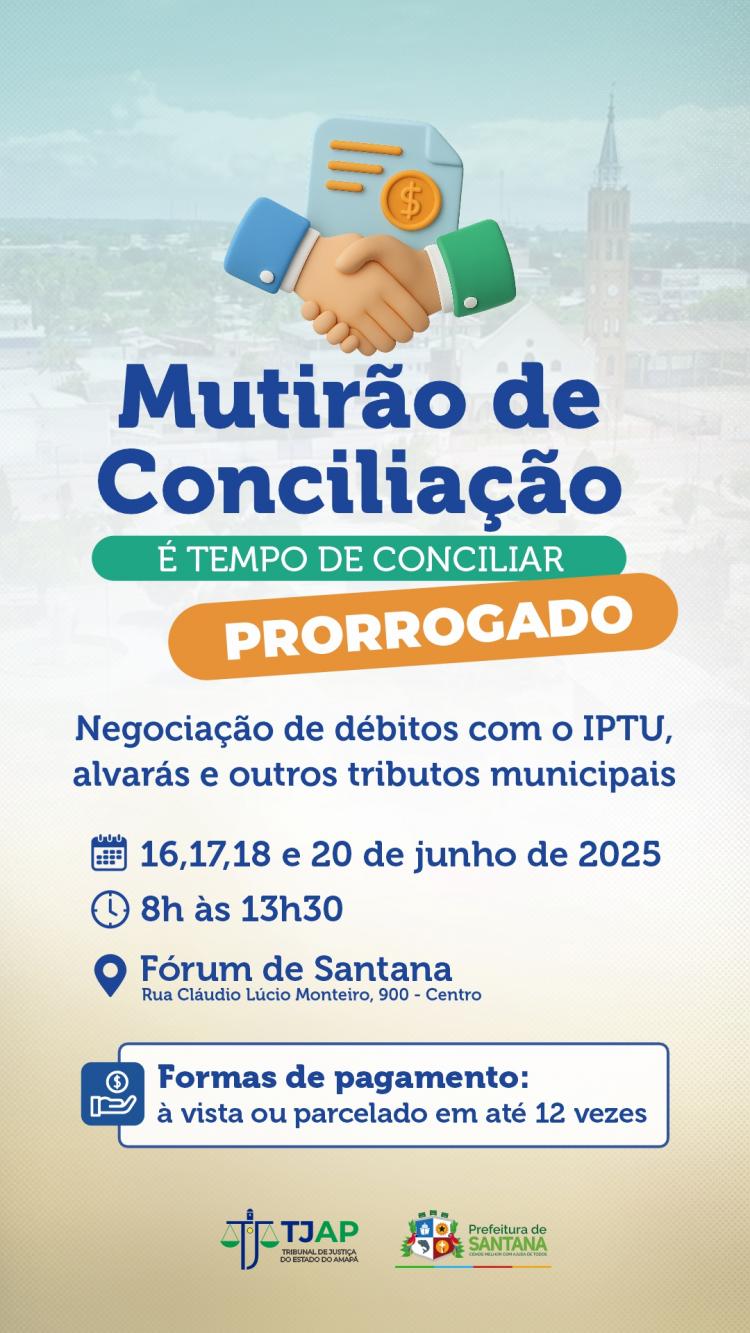 O Tribunal de Justiça do Amapá (TJAP), por meio do Centro Judiciário de Solução de Conflitos e Cidadania (Cejusc) da Comarca de Santana, prorrogou o mutirão de conciliação “É Tempo de Negociar!” por mais quatro dias (16, 17, 18 e 20 de junho). A iniciativa, realizada em parceria com a Secretaria Municipal de Finanças de Santana, oferece aos contribuintes a oportunidade de regularizar débitos tributários com condições especiais de parcelamento.