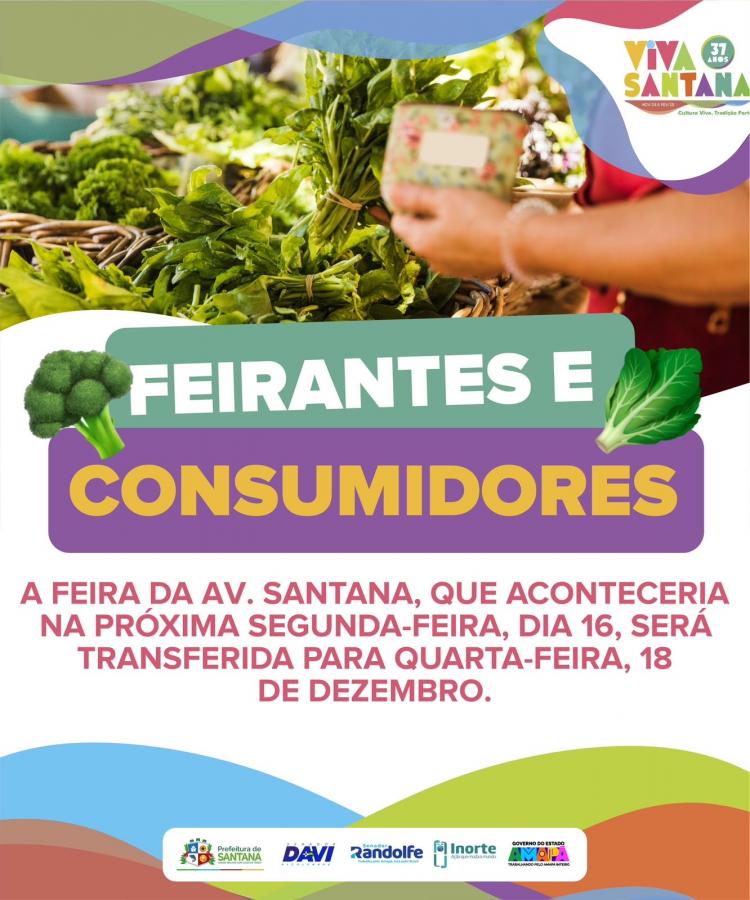 A tradicional feira da Avenida Santana, geralmente realizada às segundas-feiras, será excepcionalmente transferida para a próxima quarta-feira, 18 de dezembro, devido às comemorações pelos 37 anos de fundação do município.