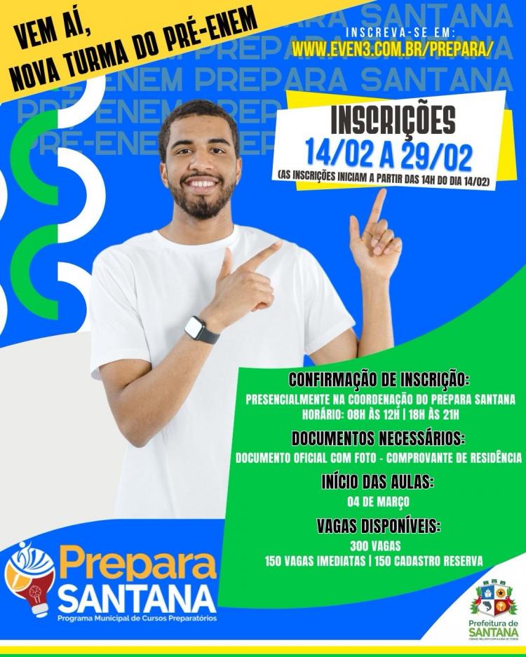 Os interessados devem realizar as inscrições através do site https://www.even3.com.br/prepara/ até o dia 29/02. Para confirmar a inscrição, os alunos devem comparecer ao Prepara Santana, localizado na Avenida Rui Barbosa, 1101, entre as rruas Salvador Diniz e Ubaldo Figueira – Centro (altos da Clínica Equilibrium), portando documento oficial com foto e comprovante de residência.