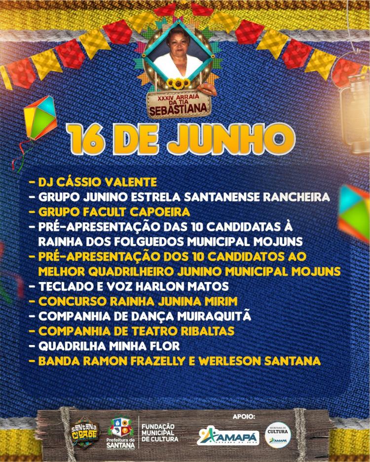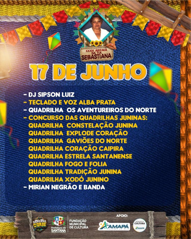 Serão duas noites do tradicional Arraiá da Tia Sebastiana, que chega à sua 35ª edição. O evento é gratuito e contará com apresentações de quadrilhas juninas, shows musicais, concurso de Rainha Junina Mirim, grupos de dança e teatro, venda de comidas típicas e artesanatos.