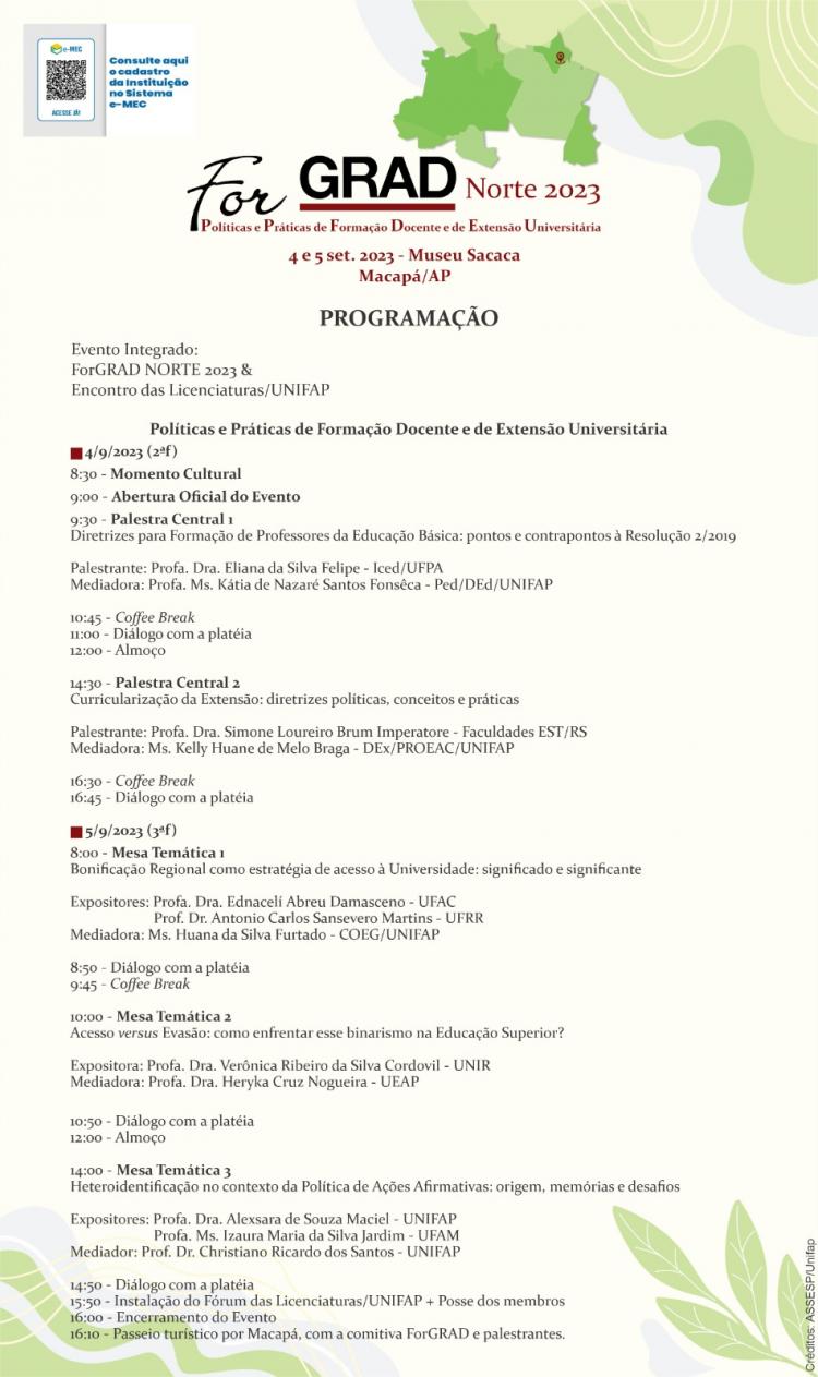 A programação do ForGRAD Norte 2023 promoverá, simultaneamente, o Encontro das Licenciaturas/Unifap. No último dia do evento, será instalado o Fórum das Licenciaturas / Unifap e a posse dos membros.