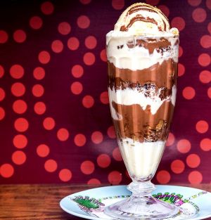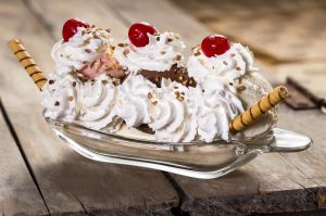 Banana Split Clássico americano criado em 1904, a banana split foi se aprimorando e ganhou diferentes versões pelo mundo. Na Johnny Rockets, rede californiana de hamburguerias ambientada nos anos 1950, a sobremesa é servida com três bolas de sorvete, cobertura à escolha, chantilly e decorada com cerejas. |
