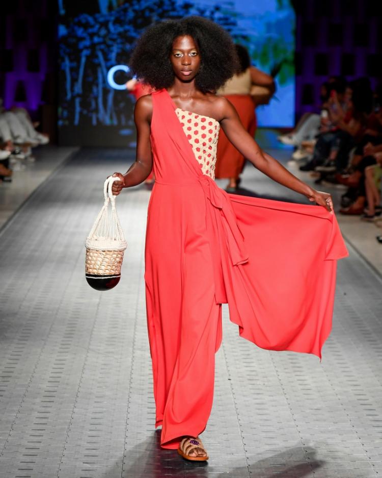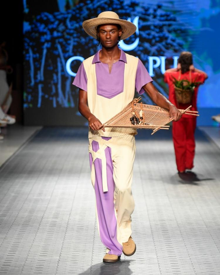 A coleção que a marca Camapu apresentou foi intitulada de “Nas Terras do Açaí”. As peças levaram o açaí como elemento principal, e outros itens secundários que têm relação, como o paneiro. A estilista, pela primeira vez, também explorou o tingimento natural nas peças, a partir de cascas de cebola e o açaí, o que gerou uma paleta de cores autênticas.