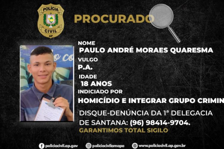 A Polícia Civil do Estado do Amapá, por meio da 1ª Delegacia de Polícia de Santana (1ª DPS), indiciou três indivíduos pelas práticas dos crimes de homicídio qualificado e por integrar organização criminosa. Dos indiciados, dois estão com mandados de prisões preventivas em aberto a Polícia Civil pede a ajuda da população com informações que levem aos paradeiros de José Luiz Castilo Jimenez, vulgo “Colombiano” ou “Venezuelano”, de 26 anos de idade, e Paulo André Moraes Quaresma, conhecido como “P.A.”, de 18 anos de idade.