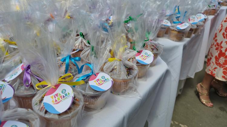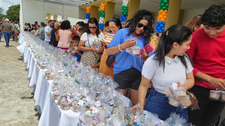 A distribuição do bolo para a população foi feita de forma organizada, com potes individuais, garantindo que todos os presentes pudessem saborear o doce.