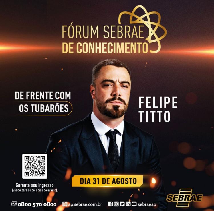O Serviço de Apoio às Micro e Pequenas Empresas no Amapá (Sebrae) promove o Fórum Sebrae de Conhecimento, na sede da instituição, no Salão de Eventos Macapá, nos dias 30 e 31 de agosto, às 19h. Nesta edição, o segundo dia do evento conta com a presença do ator, apresentador, empresário, influenciador digital e investidor do reality Shark Tank Brasil, Felipe Titto, para abordar caminhos para o sucesso empresarial e promover inovação no cenário mercadológico. O Fórum também conta com Talk Empresarial Prêmio Empresário Destaque 2023, com histórias de empresários locais e visionários.