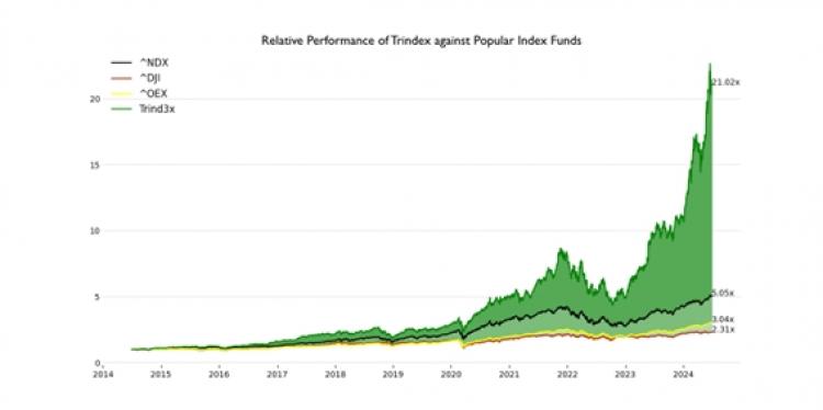 Nos últimos 10 anos, o Combined Trindex cresceu quatro vezes mais rápido do que o NASDAQ-100, sete vezes mais rápido do que o S&P 100 e nove vezes mais rápido do que o Dow.