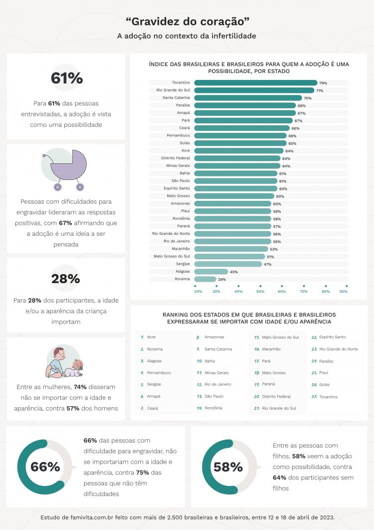 A respeito do tema, o último estudo realizado pela Famivita apontou que 61% dos brasileiros e brasileiras cogitam a adoção, sendo ela vista como uma alternativa. Nesse recorte, 28% dos participantes levariam em consideração a idade e/ou a aparência da criança. Os dados coletados também mostraram que Tocantins é o Estado em que mais pessoas veem a adoção como uma possibilidade, com 79% dos entrevistados respondendo positivamente.