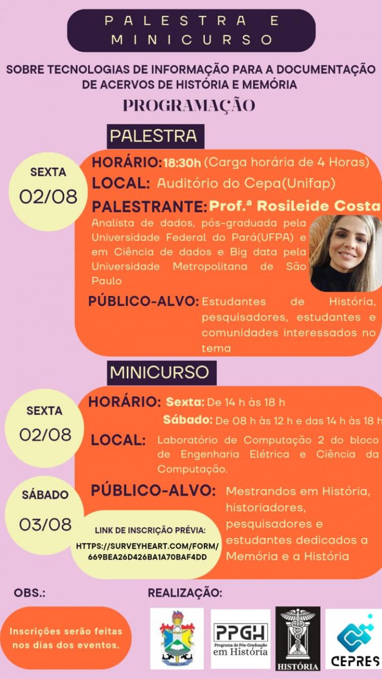 O Programa de Pós-graduação em História (PPGH), da Universidade Federal do Amapá (Unifap), promoverá evento sobre a aplicação de tecnologias da informação para a documentação de acervos de História e Memória. A palestra ocorrerá na próxima sexta-feira, 2 de agosto, às 18h30, no auditório do Centro de Estudos e Pesquisas da Amazônia (Cepa), campus Marco Zero do Equador (Macapá-AP). E o minicurso será realizado dias 2 e 3 de agosto, no Bloco de Engenharia Elétrica e Ciência da Computação, também no campus da capital amapaense.