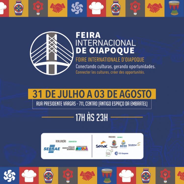 O Serviço de Apoio às Micro e Pequenas Empresas no Amapá (Sebrae), a Agência de Desenvolvimento Econômico do Amapá (Agência Amapá), o Governo do Estado do Amapá (GEA), e parceiros, preparam o município de Oiapoque, para conexões, oportunidades de negócios, integração econômica e cultural, com a realização da Feira Internacional; evento que acontece no município, na Rua Presidente Getúlio Vargas n° 711, Centro (antigo espaço Embratel), de 31 de julho a 3 de agosto, das 17 às 23h. Estão confirmados 60 expositores dos setores do comércio, serviço, indústria, turismo e economia criativa, com a perspectiva de receber 10 mil visitantes.