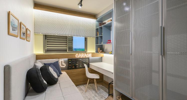 A tarefa de fazer com que as crianças guardem seus brinquedos ou objetos após alguma atividade é um desejo compartilhado por muitos pais. Esse processo de aprendizagem pode ganhar um aliado quando o espaço de armazenagem é de fácil acesso para os pequenos. No empreendimento Vibe, em Londrina (PR), foram feitas gavetas embutidas na parte de baixo da estrutura da cama. Além disso, os espaços de armazenagem foram integrados na estrutura do sofá que compõe o ambiente. “Essa solução, além de otimizar os espaços, facilita o acesso das crianças aos objetos guardados, favorecendo a autonomia, e, ao mesmo tempo, contribuindo com a organização do cômodo”, explica a arquiteta.