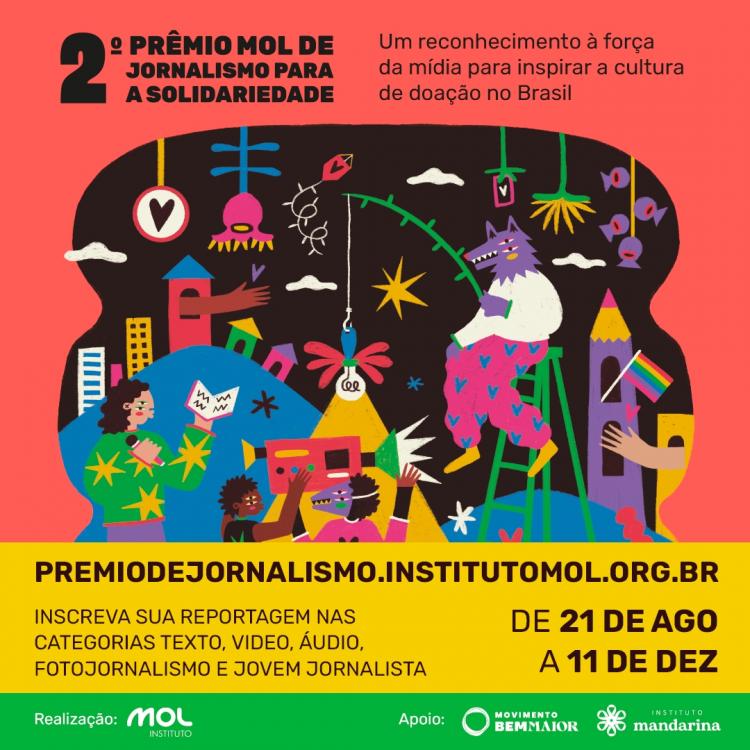 Estão abertas as inscrições para o 2° Prêmio MOL de Jornalismo para a Solidariedade, uma iniciativa do Instituto MOL para reconhecer o trabalho de profissionais e estudantes de comunicação que contribuem para fortalecer a cultura de doação, a solidariedade e a atuação das organizações da sociedade civil, destacando a importância dos temas para o exercício da cidadania. As inscrições estão abertas de 21 de agosto até 11 de dezembro.