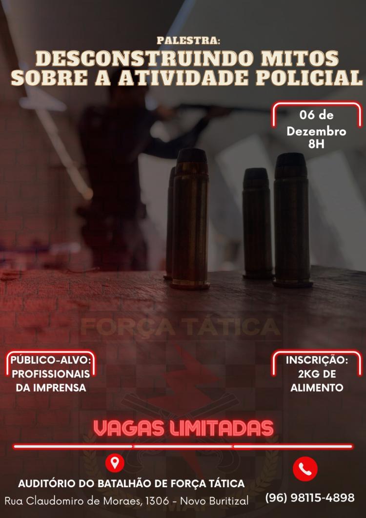 No dia 6 de dezembro (quarta-feira), o 10º Batalhão da Polícia Militar do Amapá oferecerá a palestra intitulada "Desconstruindo Mitos Sobre a Atividade Policial". Esse evento exclusivo para os profissionais da imprensa busca fornecer insights valiosos, desmistificando conceitos equivocados e promovendo uma compreensão mais aprofundada sobre a complexidade da atividade policial.