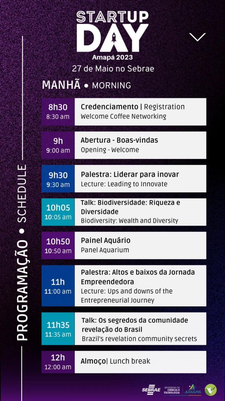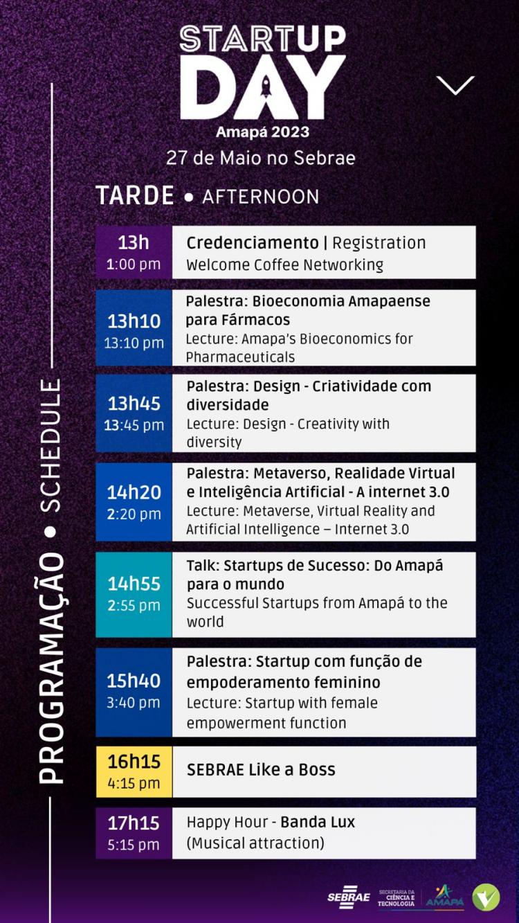 Idealizado pelo Sebrae, o evento é construído em parceria com diversos agentes do ecossistema de inovação e acontece, simultaneamente, em todo o Brasil. No Amapá, o Startup Day contará com uma programação que reúne palestrantes e painelistas para falar sobre empreendedorismo, inovação, tecnologia e bioeconomia. Além de palestras, estão previstos, talks, exposições, conexões e o Desafio Sebrae Like a Boss, com interação e conteúdo para os empreendedores.