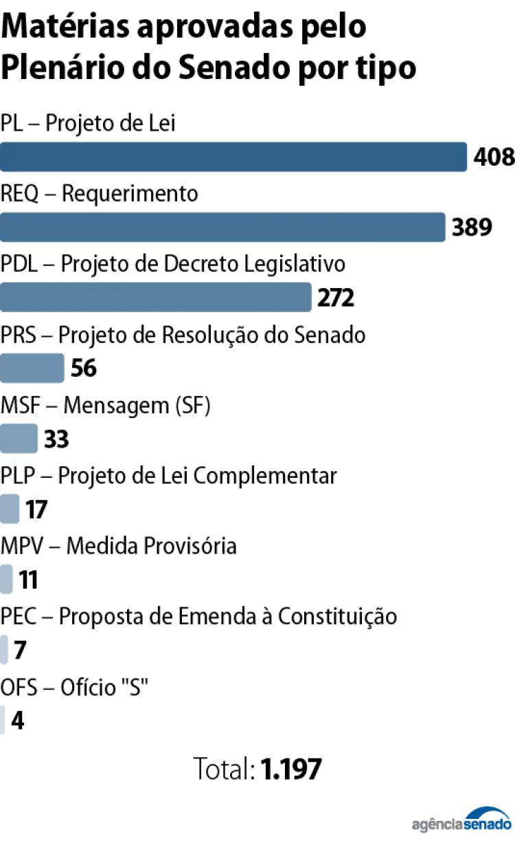 Entre os temas que passaram pelo crivo dos senadores e impactaram a sociedade em 2024 destacam-se a regulamentação da reforma tributária, a reforma do Novo Ensino Médio e as sanções do Pacote Antifeminicídio e da Política de Manejo Integrado do Fogo. Do total de proposições discutidas e aprovadas, 243 são relacionadas à infraestrutura; 173, à temática social; 147, à economia; 21 às relações internacionais; 11 à segurança pública e 10 a esportes.