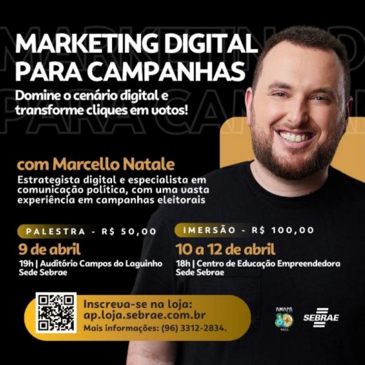 O Serviço de Apoio às Micro e Pequenas Empresas no Amapá (Sebrae), promove Palestra Show – Marketing Digital para Campanhas: ‘Redes Sociais e o Caminho para o voto’, ministrada pelo estrategista digital e especialista em comunicação política, Marcello Natale. O objetivo é contribuir de forma relevante com iniciativas empreendedoras à promoção e aos processos de campanhas, por meio da utilização das ferramentas do marketing digital e da comunicação assertiva. A palestra acontece na sede da instituição, no Auditório Campos do Laguinho, na terça, 9 de abril, às 19h.