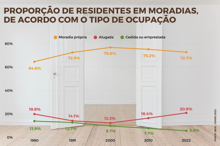 A análise por tipo de família revela diferenças significativas: 27,8% das famílias com uma única pessoa estavam alugando, enquanto a proporção subia para 35,8% para o caso de famílias com filhos. Os dados também mostram disparidades raciais na propriedade de imóveis. Enquanto 63,3% da população branca possuía casa própria, essa taxa subia para 80,8% entre a população indígena. Outro fator determinante é a idade, pois a probabilidade de possuir uma casa aumenta com o passar dos anos. Em 2022, 84,4% dos brasileiros com mais de 70 anos de idade moravam em seu próprio imóvel.