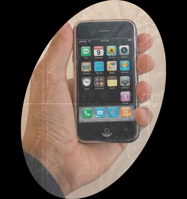 O primeiro smartphone – O primeiro iPhone abre a exposição. O seu desenvolvimento começou por volta de 2005 secretamente, e o aparelho foi anunciado oficialmente em 9 de janeiro de 2007 e lançado em 29 de junho do mesmo ano. A principal característica foi não possuir muitos botões físicos, já que os botões seriam exibidos em uma interface de tela a toque, ou touchscreen. Outras características interessantes foram a conectividade para transferência de dados, possibilitando o acesso contínuo à internet, e superando modelos de comunicação por voz.