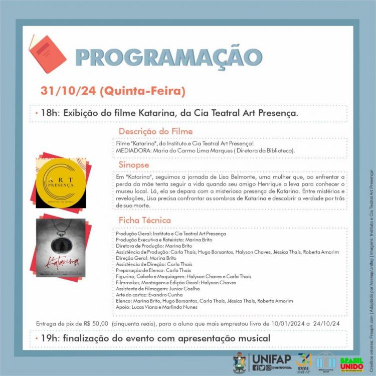 No último dia, 31 de outubro, a programação inclui uma Feira de Troca de Livros das 14h às 18h. Às 18h, a Cia Teatral Art Presença apresentará a peça “Katarina”, trazendo momentos de reflexão e entretenimento. Em reconhecimento aos estudantes mais assíduos, um prêmio de R$50 será entregue ao aluno que mais realizou empréstimos de livros entre 10 de janeiro e 24 de outubro de 2024.