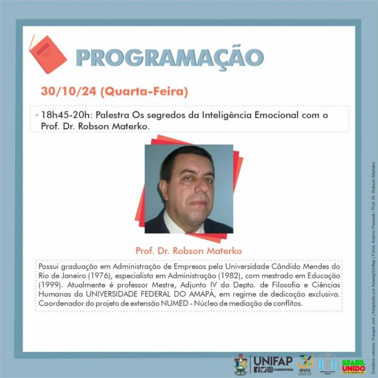 Às 18h45, a palestra "Os Segredos da Inteligência Emocional", com o Prof. Ms. Robson Materko, encerra o dia com insights sobre o gerenciamento das emoções no ambiente acadêmico e pessoal.