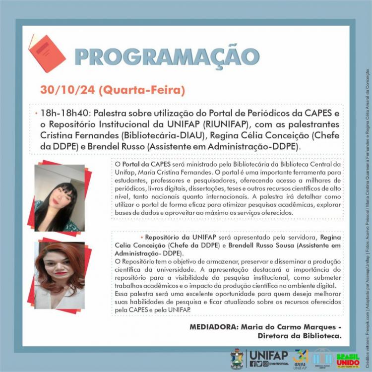 No dia 30 de outubro, os jogos recreativos continuam pela manhã e, à tarde, traz a Oficina de Histórias em Quadrinhos com o roteirista Gian Danton, às 16h. Às 18h, será realizada uma palestra sobre o uso do Portal da Capes e o Repositório da Unifap, apresentada pelas bibliotecárias Maria Cristina Quaresma Fernandes e Regina Célia Amaral da Conceição e pelo assistente administrativo Brendell Russo Araujo de Sousa. Os participantes aprenderão a acessar recursos essenciais para pesquisas acadêmicas e conhecerão o Repositório da Unifap, uma plataforma dedicada à preservação e disseminação da produção acadêmica da universidade.