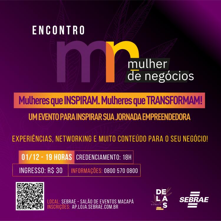 O Serviço de Apoio às Micro e Pequenas Empresas no Amapá (Sebrae), promove o Encontro Mulher de Negócios, com a participação de uma das maiores palestrantes femininas do Brasil, que revolucionou a área de cursos de treinamento e criou o método Sucesso Sem Stress (SSS), Greice Joviane. A programação fomenta o empreendedorismo e o protagonismo da mulher, fortalece os negócios e promove um momento de networking com outras empreendedoras. O encontro ocorre na sede do Sebrae no Amapá, no Salão de Eventos Macapá, às 19h.