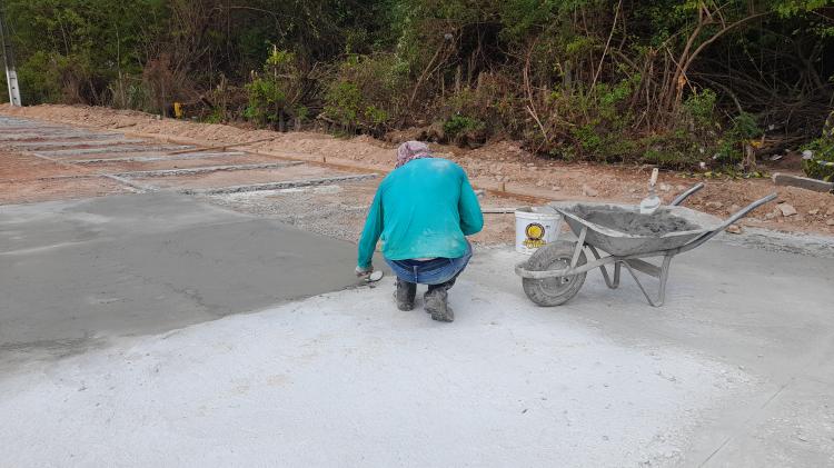 Enquanto uma equipe está preparando o terreno para a aplicação do concreto, outra está ocupada com a concretagem do calçamento, utilizando concreto usinado de alta qualidade e durabilidade.
