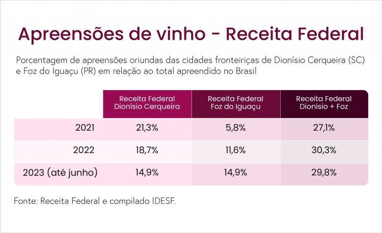 As cidades que se destacam na quantidade de apreensões - apesar da demanda de mais servidores - são Dionísio Cerqueira (SC) e Foz do Iguaçu (PR). Segundo informações da Receita Federal de Dionísio Cerqueira, está sendo introduzida no Brasil mais bebida alcoólica que no ano passado. "Estima-se que vai haver uma quantidade maior de apreensões em 2023. Mas, temos um fator limitante que é a quantidade de servidores disponíveis para as atividades de fiscalização. Mesmo assim, a tendência é de que supere os anos anteriores", destacou um dos servidores que atuam na alfândega da cidade catarinense. "Para apreender mais vinho, é só aumentar a quantidade de operações e continuarmos a contar com o apoio das outras forças policiais que sempre nos apoiam".