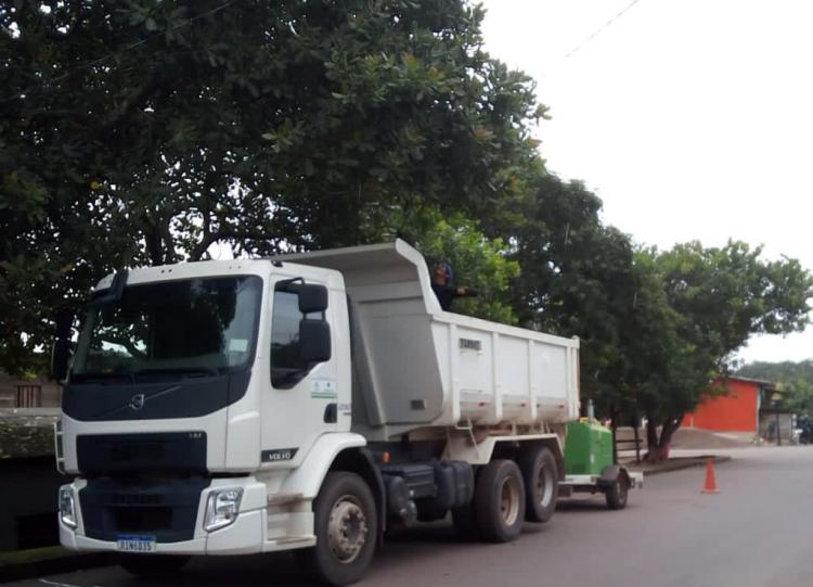 Caminhão triturador de galhos da PMS realiza poda de árvores