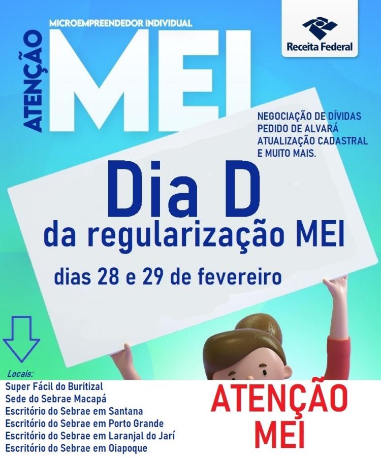 O Serviço de Apoio às Micro e Pequenas Empresas no Amapá (Sebrae) promove a Ação Dia D da Regularização MEI. O objetivo é fornecer a impressão e envio de Declaração Anual Simplificada (DAS) e emissão de Nota Fiscal Eletrônica (NF-e). O evento ocorre nos dias 28 e 29 de fevereiro, simultaneamente, na Sede do Sebrae, das 8h às 18h e nos escritórios regionais, nos municípios de Santana, Porto Grande, Laranjal do Jari e Oiapoque, das 8h às 12h e das 14h às 18h e no Super Fácil da Zona Sul de Macapá, das 8h às 13h.