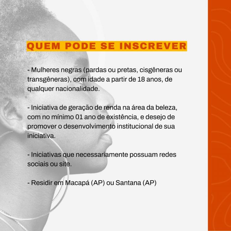 As atividades do programa incluem 20 horas de formações técnicas e político/cidadã, além de mentorias individuais e um incentivo financeiro de até R$10.000,00 para negócios de mulheres. Essas atividades e aportes financeiros serão direcionadas a uma turma de 20 mulheres negras selecionadas, que residam nas cidades de Macapá e Santana, e atuem no setor da beleza.