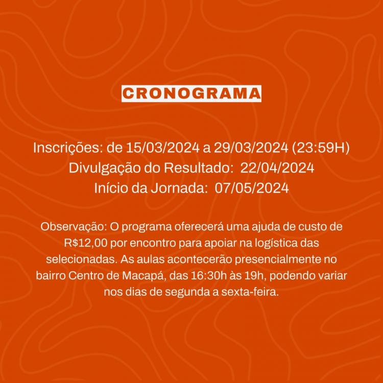 É importante destacar que: Serão 2 meses de cursos presenciais em Macapá, o projeto destinará, uma ajuda de custo de R$12,00 para o transporte das alunas selecionadas. As aulas acontecerão no centro de Macapá de 16h30 às 19h de segunda a sexta-feira, podendo variar de acordo com cada dia.