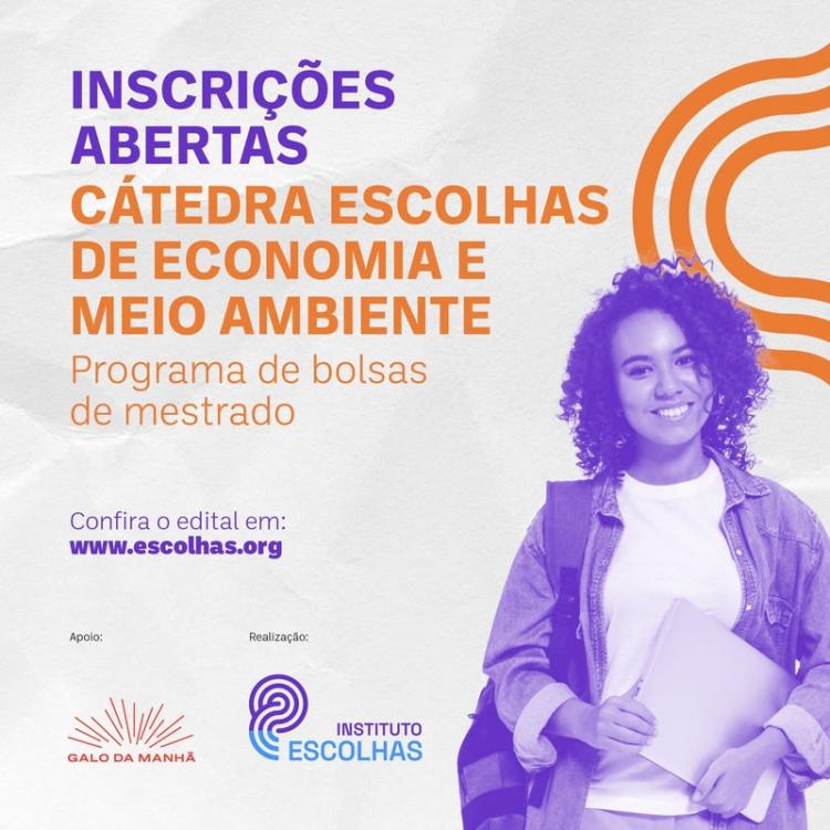 Único programa de bolsas do país com foco na interface entre economia e meio ambiente, a Cátedra Escolhas está com as inscrições abertas para a seleção de novos bolsistas até o dia 29 de fevereiro. São elegíveis mestrandas e mestrandos em Ciências Econômicas e áreas afins, nascidos na Amazônia Legal ou que estejam matriculados em instituições de ensino estabelecidas na região, conforme descrito no edital. O programa prioriza candidatos indígenas e afrodescendentes.