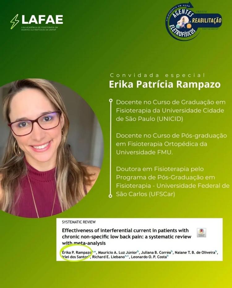 O Projeto de Extensão “Agentes Eletrofísicos: Reabilitação”, vinculado ao Programa de Formação, Aperfeiçoamento, Qualificação Profissional e Idiomas (Profid), da Universidade Federal do Amapá (Unifap), realizará evento dia 24 de abril, às 20h30, para discutir o artigo científico intitulado "Eficácia da IFC em pacientes com dor lombar crônica inespecífica", trazendo como palestrante convidada a Dra. Erika Rampazo, autora do artigo e especialista na área.