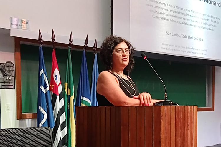 “Foi sobretudo com sua orientação científica apaixonada e séria que a professora Maria Carolina deixou para sempre sua marca no cenário da inteligência artificial brasileira. Orientou 35 mestres e 16 doutores – e ela dizia que esses eram os filhos dela”, destacou a professora Solange Rezende durante a cerimônia. “O mais relevante é o quanto esses 16 doutores, em especial, ajudaram a nuclear a inteligência artificial em todas as instituições brasileiras, de alguma forma”, completou a professora, que começou a ser orientada por Maria Carolina em 1987, quando ingressou no mestrado em Ciências de Computação e Matemática Computacional no ICMC.