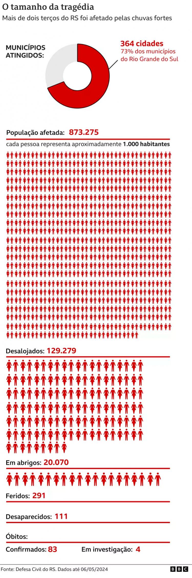 Confira gráficos produzidos pela BBC News Brasil ajudam a ter uma dimensão do grande impacto que esse desastre está causando e o problema que acomete o RS.