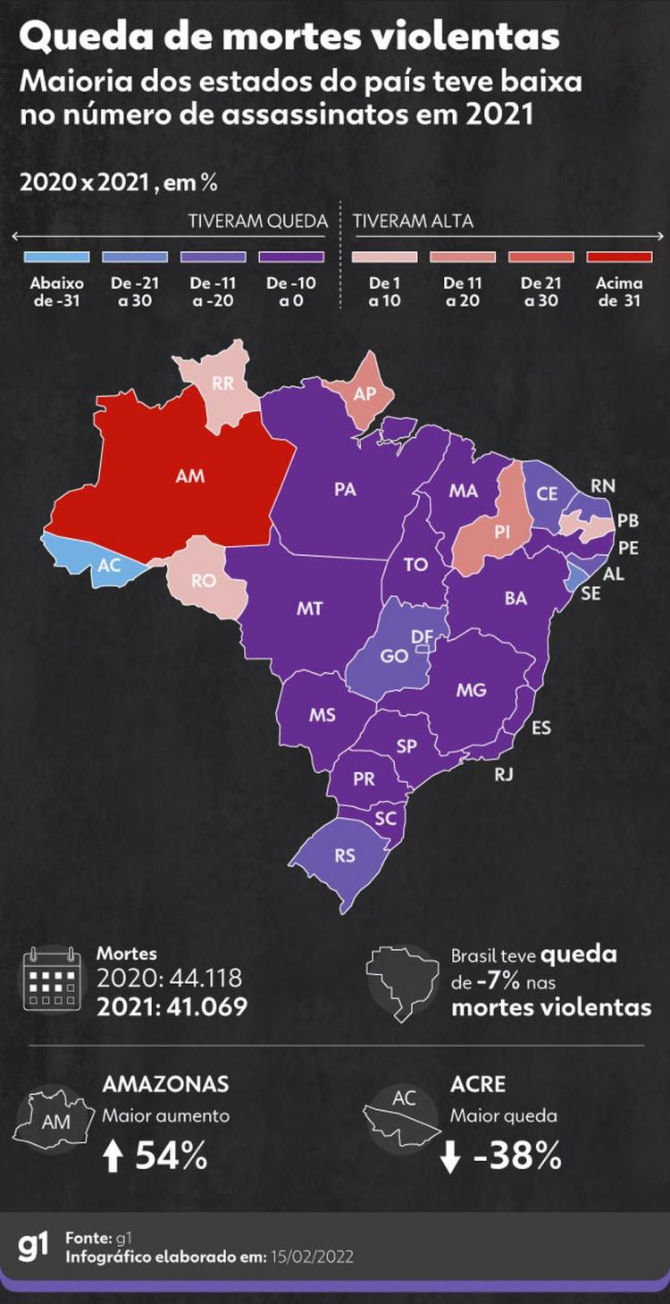 A alta no Amapá vai na contramão dos dados nacionais, que registraram queda de 7%, mas o estado seguiu a tendência da Região Norte, onde os assassinatos elevaram 10% e quatro dos sete estados tiveram mais mortes em 2021 do que em 2020.